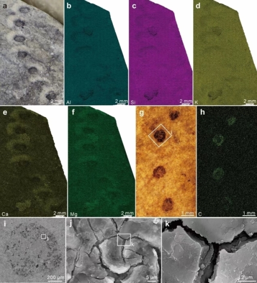 以碳质压膜形式保存的Horodyskia moniliformis标本及其元素分布、扫描电镜图片