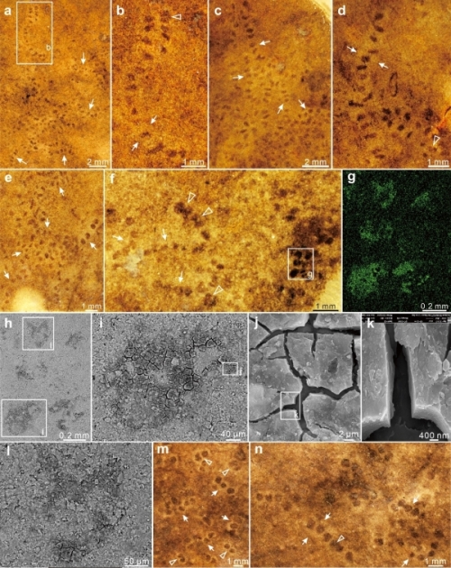 同其他产地的霍氏串珠标本一样,此次发现的霍氏串珠“珠子”的周围保存着浅色的光晕结构,并通过光晕之间的接触、叠覆将相邻的“珠子”进行连接。光晕与“珠子”之间的边界清晰,但与围岩边界相对模糊。在同一标本中,光晕有时会向“珠子”的同一侧偏移,导致其在“珠子”的一侧相对较宽、另一侧相对较窄;且较宽的一侧通常凸出层面。上述特征表明,光晕可能具有较大的形态可塑性。相较于“珠子”,光晕结构还表现出保存的不稳定性:在同一层位,具光晕和不具光晕的标本可以共存,甚至同一个霍氏串珠标本中也存在具光晕和不具光晕的“珠子”。相较于保存了碳质压膜/有机质壁的“珠子”,光晕几乎检测不到有机质的保存;相较于围岩,光晕更富集钙、镁元素,而铝、硅、钾元素则在围岩中相对更多,可能是生物体死后矿物在光晕内部被诱导沉淀所导致。本研究将光晕结构解释为一种围绕“珠子”的凝胶质基质,类似于细胞外粘液或胞外聚合物(EPS),其形态是在生物体死后以矿物沉淀形式保存。