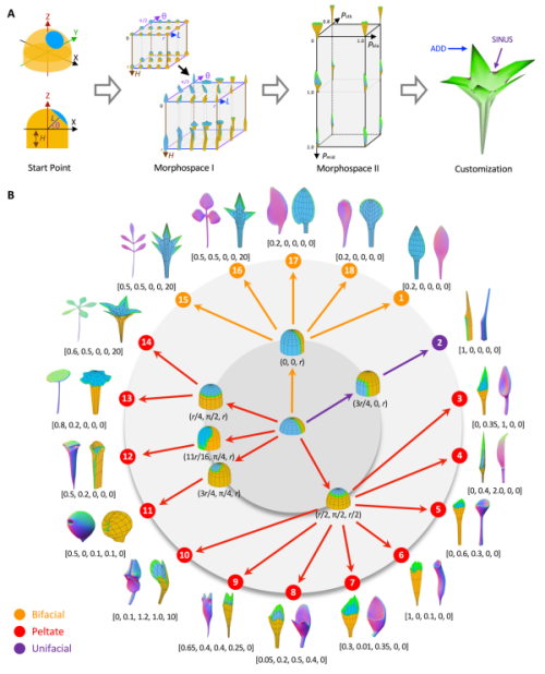 中国科学院植物研究所孔宏智研究组以毛茛科植物的花瓣为研究材料,综合利用三维成像、基因表达、功能验证及计算机模拟技术,系统探究了盾状结构形成和多样化的机制。研究发现,与盾状叶相似,盾状花瓣的形成也是由背腹性基因表达范围的转变引起,不同类型盾状结构的形成则是由背腹性程序表达转变的程度和器官不同区域生长速率的差异所致。该研究通过引入描述器官原基上背腹性程序作用范围的3个参数和器官不同部位生长速率的6个参数,提出了简单且具有普适性的计算机模拟系统。基于该系统,自然界中发现的大多数植物侧生器官均能被模拟出来。该研究揭示了盾状结构形成和多样化的机制,并进一步强调了计算机模拟在生物学研究中的重要性。