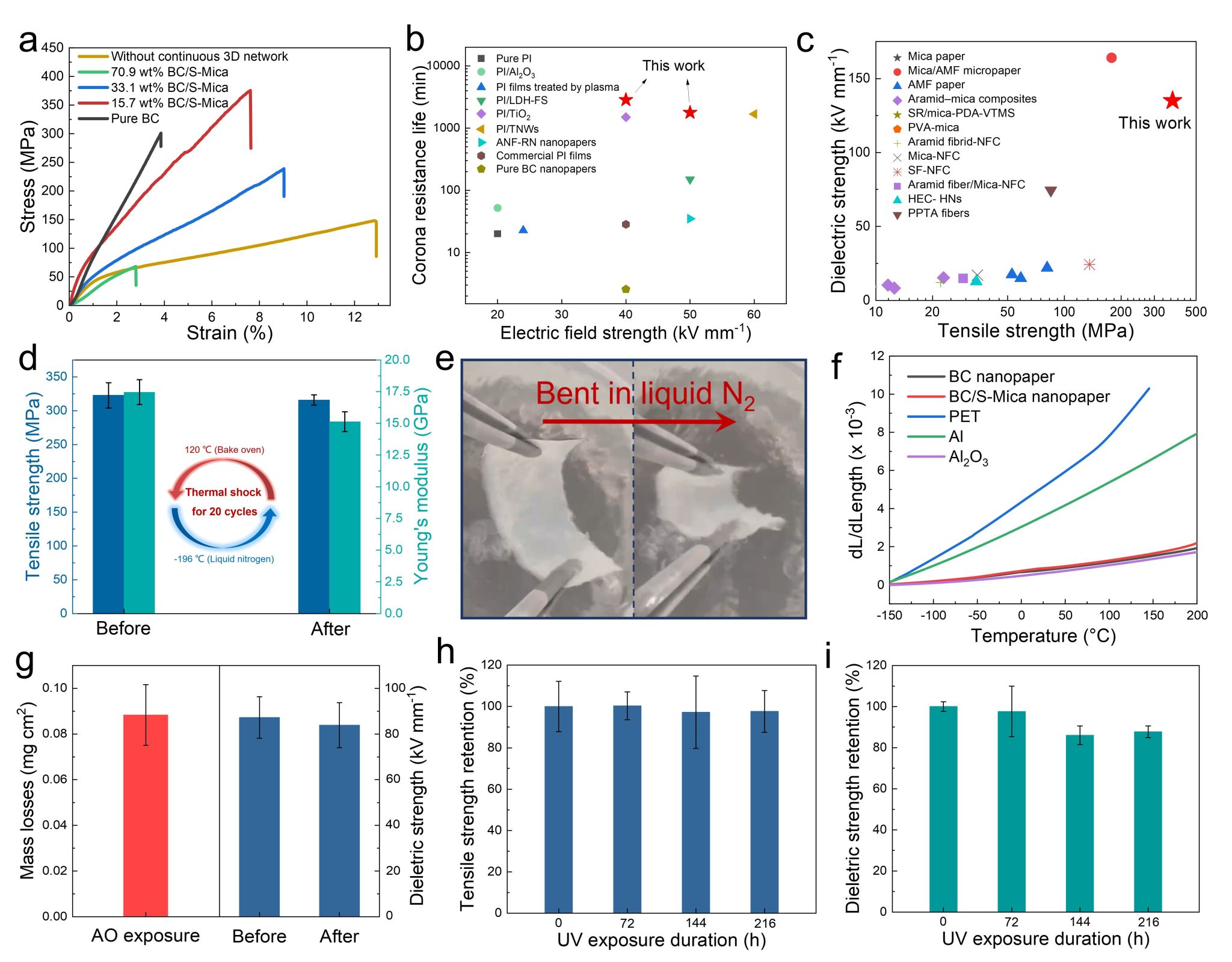 图2 纳米纸的综合性能。(a)纳米纸的力学性能表征;(b-c)纳米纸的综合性能与文献中绝缘材料的对比;(d)纳米纸热振前后的力学性能对比;(e)纳米纸在液氮中弯曲照片;(f)纳米纸的热膨胀系数;(g)纳米纸对原子氧的耐受性表征;(h-i)纳米纸对紫外线的耐受性表征。