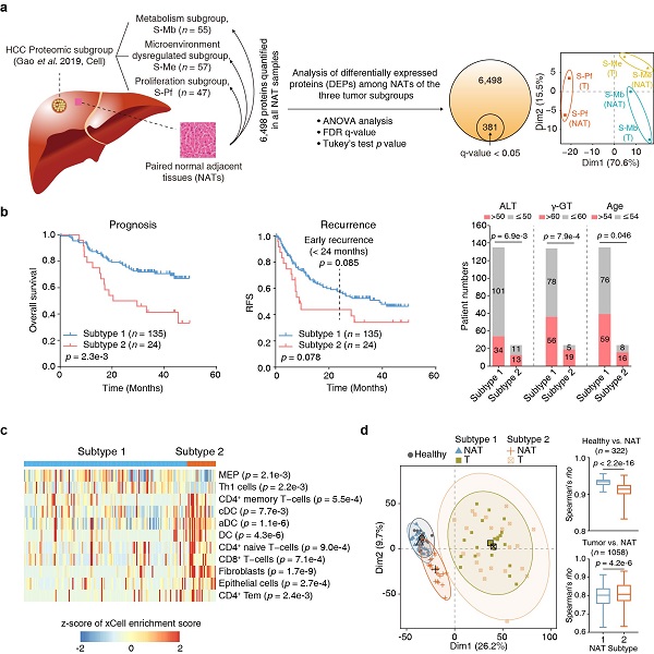 研究人员前期根据蛋白质组特征将肝细胞癌分成代谢驱动型、微环境失调型和增殖驱动型三个亚型。研究对三个亚型的配对癌旁组织进行蛋白质组分析发现了其具备对应癌组织的分子分型特征,这提示癌旁组织蛋白质组具有分子异质性(图a)。基于此,科研人员采用非监督聚类方法,根据蛋白质组数据将癌旁组织分为S1型和S2型两个亚型。其中,S2型病人约占病人总数的15%,病人年龄偏大,ALT和γ-GT含量较高,预后较差且有较高的复发风险;S2型癌旁组织高表达的蛋白显著富集到ECM-受体相互作用通路、抗原处理和呈递、细胞粘附、PI3K-Akt信号通路等,而低表达的蛋白显著富集到各种代谢相关通路。上述癌旁组织分型标准在前期贺福初院士团队与樊嘉团队合作发表的高质量肝癌癌旁蛋白质组数据集中得到了验证(图b)。利用解卷积算法,该团队在癌旁组织中预测了组织浸润免疫细胞组成,发现了S2型癌旁组织中树突状细胞、CD8+T细胞、成纤维细胞等含量较高,并采用多重荧光免疫组化在癌旁组织芯片中进行了验证(图c)。进一步,该团队采用DIA-MS技术,对正常肝组织、两个亚型的癌旁组织及其配对癌组织进行了定量蛋白质组学分析,同时,聚类分析发现S1型癌旁与正常肝组织类似,而S2型癌旁与癌组织更为接近。相比于正常组织,在S1型癌旁组织中有112个上调蛋白和71个下调蛋白;其中13个上调蛋白为分泌蛋白,可作为潜在血液生物标志物用于肝癌的早期诊断;另一些差异蛋白,可能参与肿瘤的免疫微环境重塑或促进肿瘤复发(图d)。