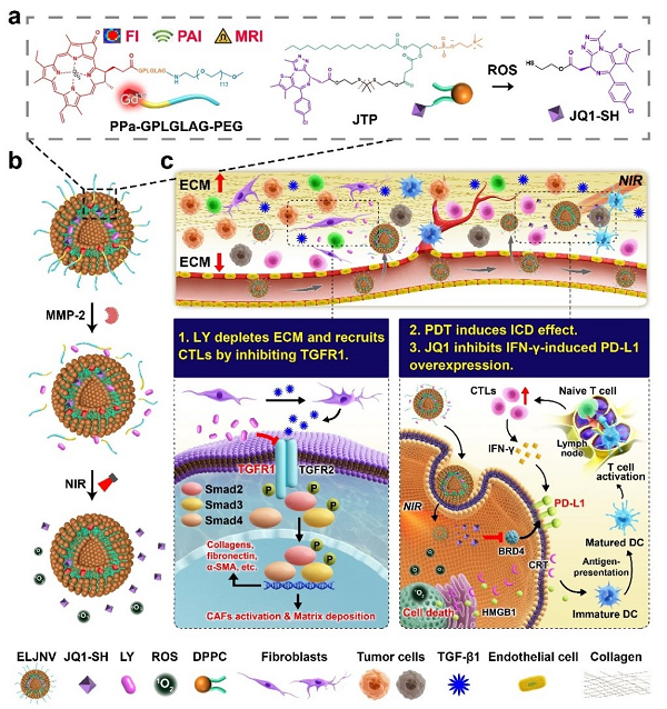 科研人员利用生物信息学分析发现TGFBR1在多种实体瘤中显著上调。激活的TGF-β信号通路可促进肿瘤相关成纤维细胞(cancer-associated fibroblasts,CAF)分泌细胞外基质,形成“物理屏障”,阻碍细胞毒性T淋巴细胞(cytotoxic T lymphocytes,CTLs)向肿瘤内浸润,上调调节性T细胞(regulatory T cells,Tregs),进而导致免疫抑制微环境。为了克服TGF-β信号通路介导的免疫耐受,科研团队设计了一种包载TGF-β受体1抑制剂和光敏剂焦脱镁叶绿酸a(Pyropheophorbide-a,PPa)的酶激活纳米囊泡(ELNV)。其中,PPa螯合钆离子(gadolinium,Gd3+)后能够实现荧光、光声和磁共振多模态成像,引导671 nm波长近红外光精准照射肿瘤部位。在671 nm激光照射下,PPa可发挥光动力作用生成活性氧,促进药物释放并触发肿瘤细胞的免疫原性细胞死亡,提高肿瘤细胞的免疫原性、招募肿瘤浸润CTLs。为了进一步克服IFN-γ诱导的肿瘤细胞表面PD-L1表达和获得性免疫耐受,科研人员在ELNV纳米囊泡中包裹ROS响应的BRD4抑制剂JQ1,得到共递送前药纳米囊泡(称为ELJNV)。小鼠水平的抗肿瘤药效评价结果表明,ELJNV可以有效抑制多种免疫排斥型肿瘤生长、转移和复发。本研究有望为IETs的高效免疫治疗提供重要参考。