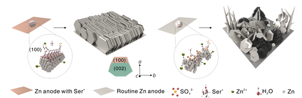 水系锌离子电池(AZIBs)因具有高的安全性、可靠性、环境友好性和成本效益而备受关注。然而,锌枝晶生长会引起较差的可逆性,严重时会引发电池短路,这是水系锌离子电池商业化进程的主要障碍。锌(100)面具有较高的表面能,锌负极的成核和沉积易沿[100]方向进行,而较高的反应活性会诱发副反应,进而损害锌阳极的可逆性和电池的循环稳定性能。因此,抑制锌(100)方向生长可有效缓解枝晶生长和副反应发生。