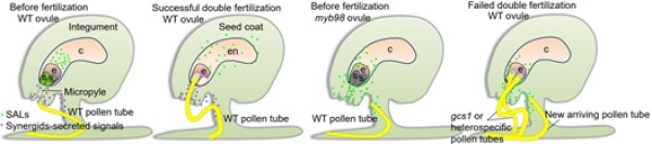 李红菊研究组通过抽丝剥茧层层论证,最终证明SAL1/2在助细胞失效时被分泌到珠孔外,发挥吸引花粉管的功能,直接证明了中央细胞通过分泌SAL1/2直接参与植物的受精恢复机制。
