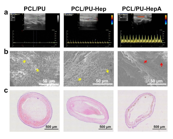 图2. (a)各血管支架植入后的CDFI图像;(b)支架吻合口处的SEM图像;(c)支架横截面的H&E染色图像。