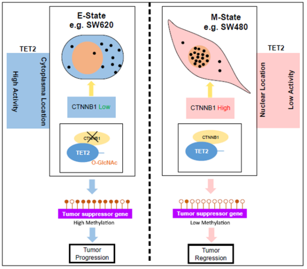 β-catenin介导TET2核转位抑制肠癌进展机制示意图