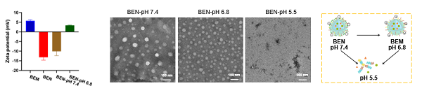 该研究合成了pH敏感的两亲性聚(β-氨基酯)衍生物,并用其构建了共递送MDSC抑制剂恩替诺特(ENT)和PD-1/PD-L1抑制剂BMS-1的胶束(BEM)。进一步,该工作将BEM与清道夫受体A(SR-A)的配体硫酸葡聚糖(DXS)通过静电吸附形成复合纳米粒BEN。BEN具有级联酸敏感性,即在pH 7.4时稳定、pH 6.8时DXS外壳脱落、pH 5.5时胶束解离。