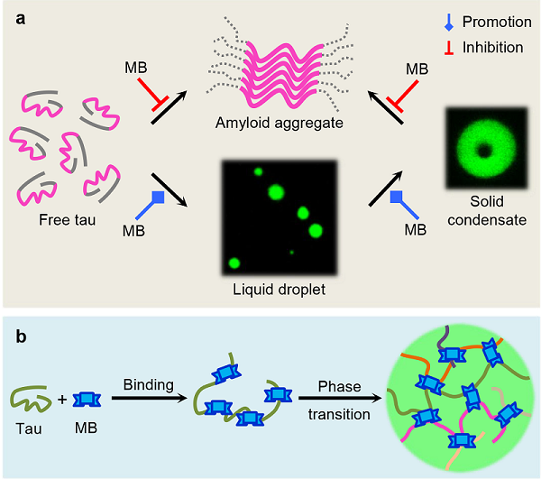 亚甲基蓝(MB)调控Tau蛋白相分离及淀粉样纤维化的作用机制示意图