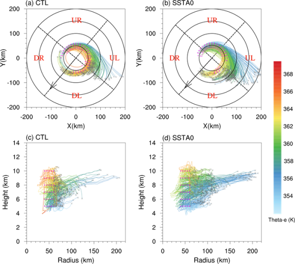 图1. (左)高海温控制试验CTL和(右)低海温对照试验SSTA0试验中干空气入侵轨迹的(a、b)平面分布与(c、d)半径-高度分布,灰色×代表气块距离TC中心的最远半径,洋红色圆点代表气块的终点位置,轨迹颜色代表相当位温;(a、b)中的黑色箭头代表平均环境风切变方向;DR、DL、UR和UL分别代表顺切变右侧、顺切变左侧、逆切变右侧和逆切变左侧。