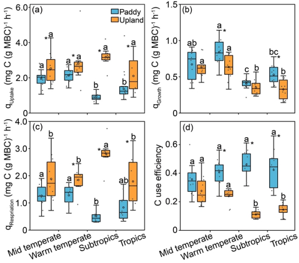 我国东部四个气候区稻田和旱地土壤微生物碳摄取、生长、呼吸和碳利用效率
