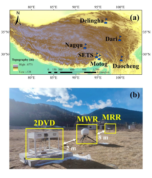 图1. 研究区域示意图。(a)青藏高原雨滴谱对比研究站点;(b)藏东南降水微物理过程观测仪器。