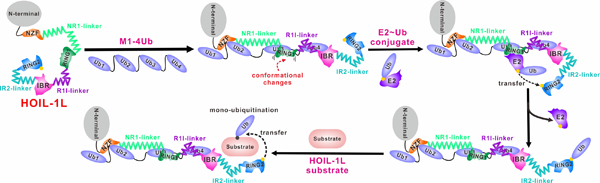 线性泛素链结合促进HOIL-1L的E3酶活性的作用模型图