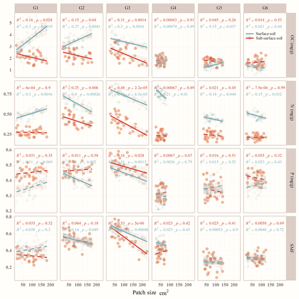 研究表明,结皮层土壤的碳和氮含量明显高于结皮下层土壤,而磷含量则低于下层土壤。斑块面积大小对土壤养分的影响颇为显著,特别是结皮层土壤的氮含量与斑块面积呈显著负相关关系,斑块越大越不利于荒漠土壤对氮素的固持和积累。气候、土壤特性和藓类结皮斑块大小共同影响结皮层和下层土壤的多功能性。气候因素对结皮层土壤的影响更显著,而土壤特性和藓类结皮斑块大小对结皮下层土壤养分的影响则更大。本研究进一步量化了结皮层和下层土壤养分特征的差异性,揭示了结皮斑块面积作为生物土壤结皮的基本功能单元对荒漠土壤养分特征和功能的影响,具有明显的类似于植被景观斑块的面积效应。上述研究将更好地揭示生物土壤结皮在养分循环中作用,对干旱地区的土地管理和保护具有实际意义。