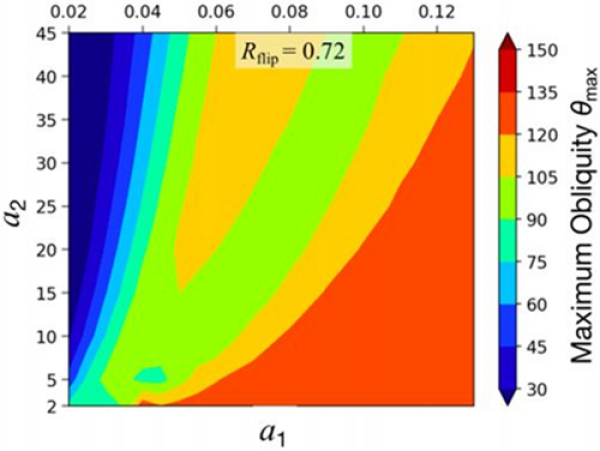 研究表明,在双星摄动作用下,红矮星周围的类地行星发生自转轴翻转概率普遍较大,且行星自转轴倾角随轨道半长径比值的增大而增大。研究针对伴星轨道半长径小于45 au的密近双星系统,通过在轨道半长径的参数空间模拟发现:行星质量越大,其自转轴发生翻转的概率越大,且发生逆向自转的概率可达72%(图2)。