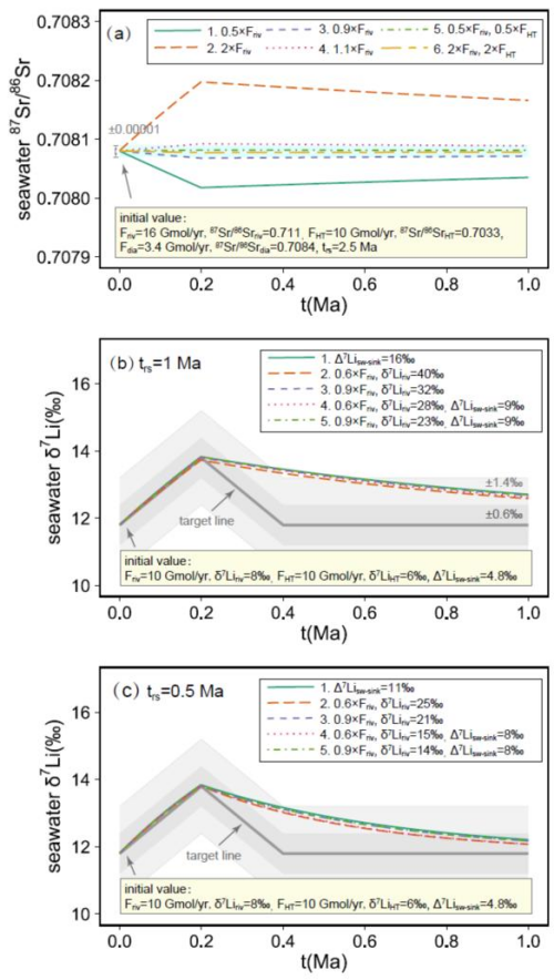 不同尺度的输入端元变化对海水锂-锶同位素组成的影响的模拟结果