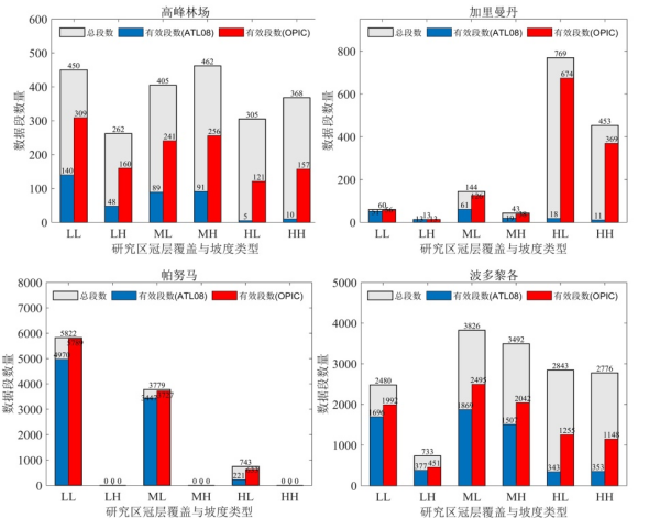 不同的冠层覆盖和坡度场景下地面光子优化算法(OPIC)与ATL08产品提供的冠层高度有效数据段数的对比。低覆盖(L)、中覆盖(M)、高覆盖(H);低坡度(L)、高坡度(H)。