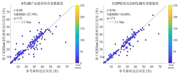 森林高度估测精度。左图:ICESat-2官方产品精度;右图:OPIC算法优化后的估测精度。