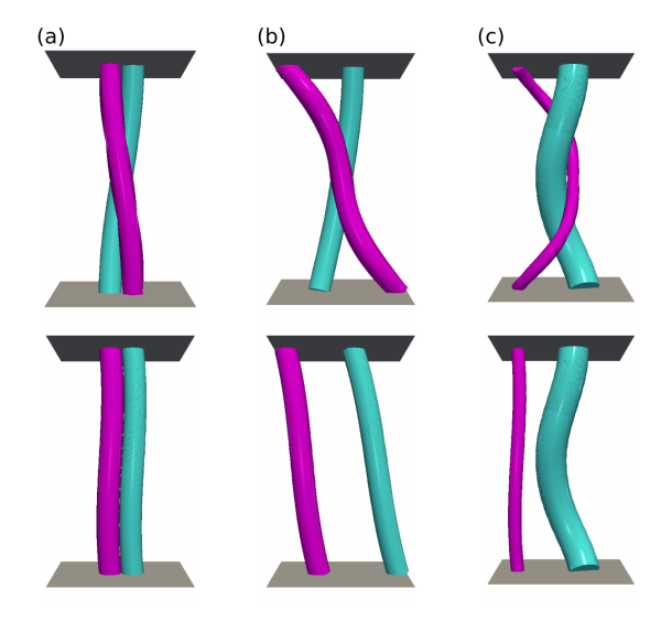 图2. 编织的冕环结构演化的示意图。a为观测无法分辨的形态,b和c对应在ML图像中观测到的形态。