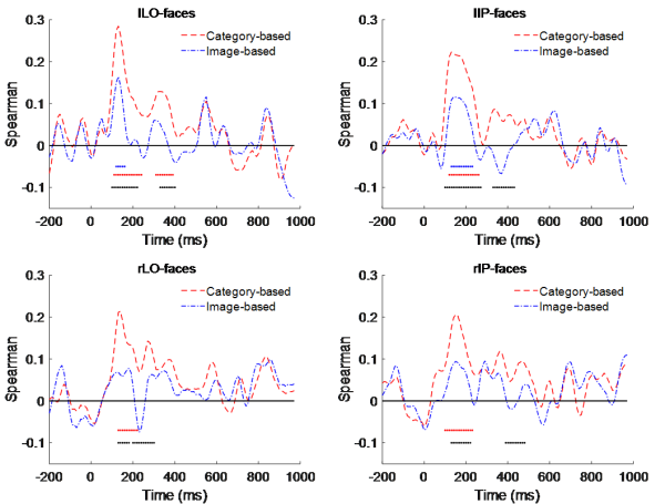 为了探讨这些面孔选择区域解码表情信息的本质,科研人员训练具备表情识别能力的卷积神经网络,再提取表情图片在不同卷积层的特征计算Image-based RDM(基于图像)和Category-based RDM(基于类别)。表征相似性分析(representational similarity analysis,RSA)的结果显示,甚至在刺激后的约100 ms,相比于面部表情的图像级信息,LO-faces和IP-faces的神经活动与其类别级信息更相似(图4)。