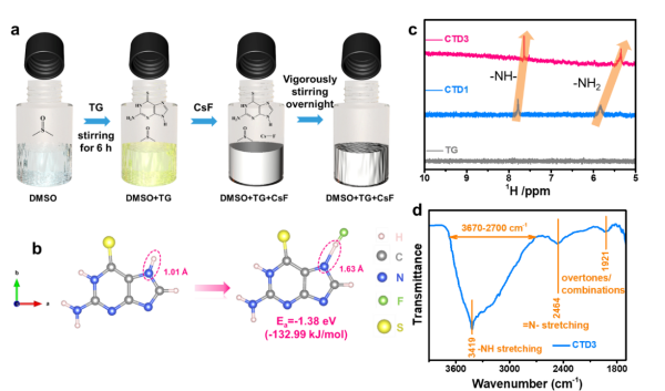 该工作首先制备了室温下不同氟盐浓度的电解液。通过对不同电解液的核磁共振谱和红外光谱分析,证实了TG分子对氟盐在非质子溶剂二甲基亚砜(DMSO)溶解的促进作用;进而发现代表TG分子氢键链的宽峰发生窄化和蓝移现象,结合吸附作用计算,表明TG分子咪唑环上-NH-的氢是TG对氟离子的作用位点,而这种作用相对于硼基AA对氟的吸附作用更弱,更有利于氟离子的迁移和脱溶剂化。基于该系列电解液,同时以CuF2和Pb分别为正负极组装的室温氟离子全电池,在50 mA/g电流密度下,初始放电容量最高可达381 mA h/g,循环40次后仍有126 mA h/g的可逆容量,极化电压可低至0.36 V。进一步对正负极的物相演变进行表征,研究人员发现放电过程中正极发生脱氟反应,负极发生氟化反应,表示为CuF2 (正极) + Pb (负极) → Cu + PbF2,充电过程则相反,表示为Cu (正极) + PbF2 (负极) → CuF2 + Pb。