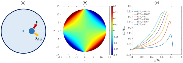 研究发现,当外力不平行也不垂直于颗粒-腔体连心线时,颗粒会朝垂直于外力方向漂移(图2a)。该研究揭示了颗粒漂移源于受限诱导的迁移率张量各向异性。在球腔对称面上,圆球颗粒的漂移速度呈中心对称分布(图2b)。研究显示:当颗粒靠近腔体中心(壁面)时,漂移速度会随颗粒径向位置的增加而升高(降低);颗粒与腔体的尺寸比越大,同一位置的归一化漂移速度越大(图2c)。除空间位置、颗粒受限程度之外,长球和扁球颗粒的漂移速度还与颗粒姿态角呈正弦函数关系。