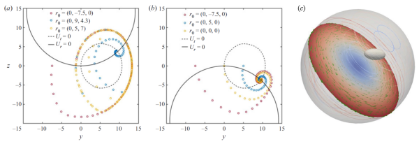 在实际应用中,当细胞、液滴随流体运动时,通常会同时呈现平动和转动两种运动模式,而转动会导致其内部产生旋转流。基于此,该团队探讨了颗粒在腔内旋转流中的运动。当颗粒密度大于(小于)流体密度时,颗粒在旋转流中受离心(向心)力作用。研究表明:在腔内任一位置释放颗粒,受离心力作用的颗粒最终会进入球腔对称面内的稳定轨道(图3a);受向心力作用的颗粒最终会运动到同一驻点(图3b)。上述成果为微液滴内不同密度颗粒的汇聚与分离提供了新思路。
