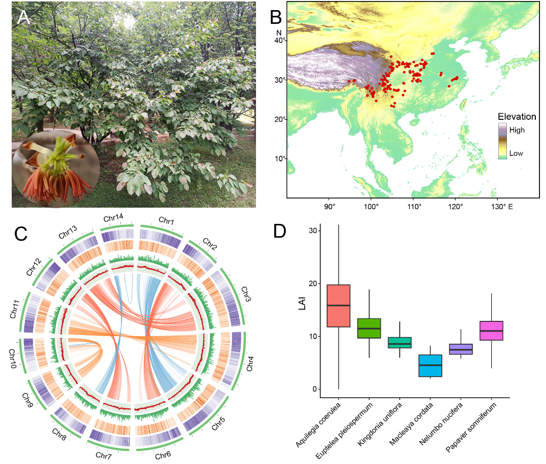 中国科学院植物研究所研究员王伟团队等以起源于白垩纪的活化石植物——领春木科(Eupteleaceae)为研究对象,通过整合系统发育基因组学、比较基因组学和生态位模拟等分析方法,研究了该科植物的分子进化速率及其机制。研究人员组装了领春木科首个高质量的、染色体水平的核基因组,同时也组装了叶绿体和线粒体基因组。研究结果表明,在真双子叶植物最基部类群——毛茛目(Ranunculales)中,领春木科是最早分化的科,并与其他毛茛目物种共享一个古老的全基因组复制事件。领春木科的三套基因组,以及同一基因组内具有不同功能的基因都具有极低的分子进化速率,这可能与其保守的核基因组结构、木本习性以及保守的生态位需求有关。此外,研究还发现毛茛目早期分化的支系以及其他基部真双子叶植物类群都参与了白垩纪早期的陆地革命。