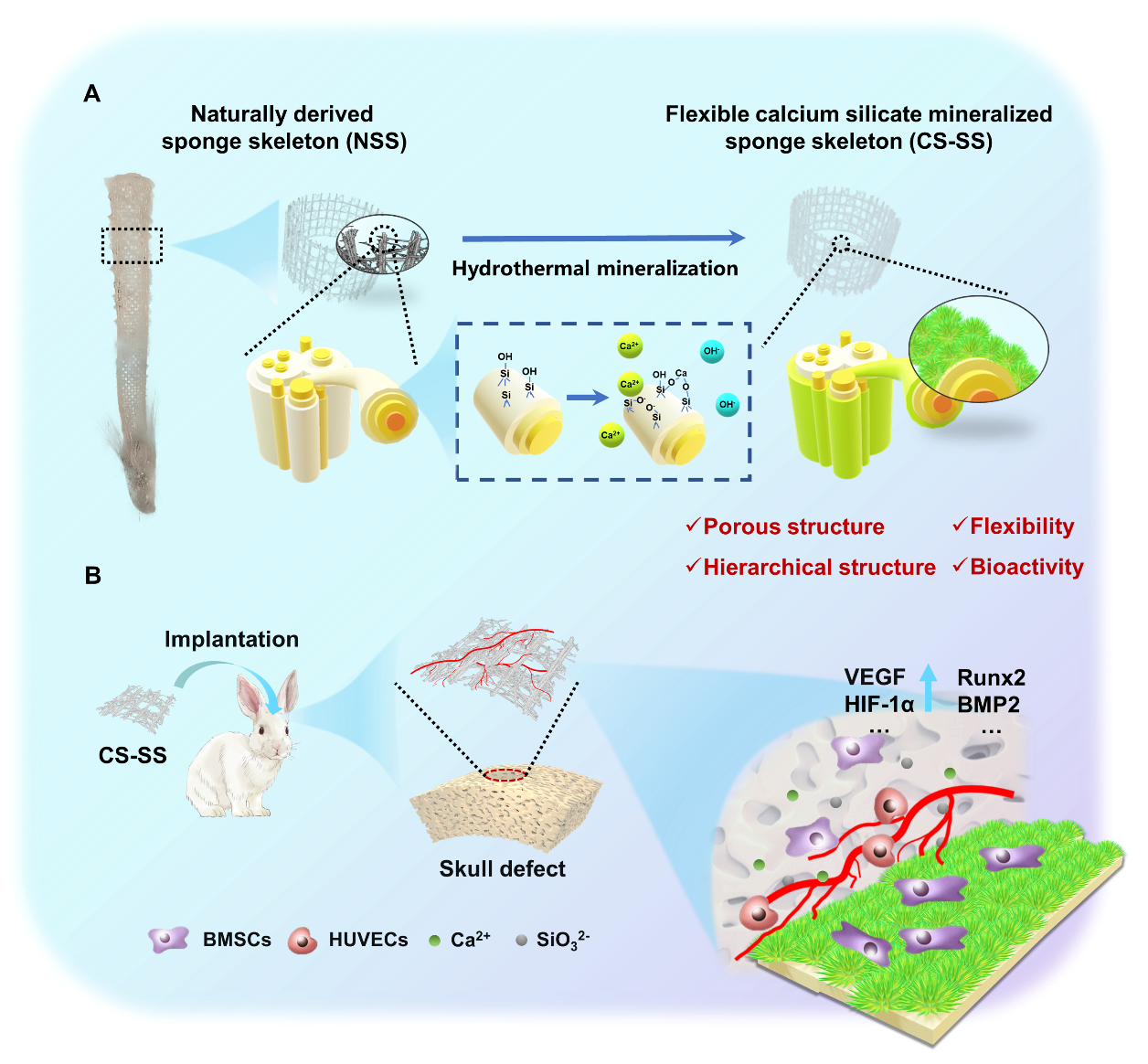生物活性陶瓷因具有优异的生物相容性及成骨活性而广泛运用于骨组织工程中。然而传统的生物陶瓷支架往往需要经过高温烧结成型,不但消耗大量能量,同时其本征脆性极大限制了其应用,特别是在颅骨、眶骨等薄壁不规则骨组织的修复中,支架植入后往往由于应力等原因导致破碎从而影响骨再生效果。因此,制备出具有优异可加工性能和力学强度的柔性生物陶瓷支架是一项挑战。海洋中的海绵动物——偕老同穴,具有由二氧化硅骨针纤维所构成的笼型网格状宏观结构,而骨针纤维具有同心圆层状微观结构。这种独特的多级结构使得海绵骨架在高无机含量(>95%)下仍然保持优异的柔韧性。