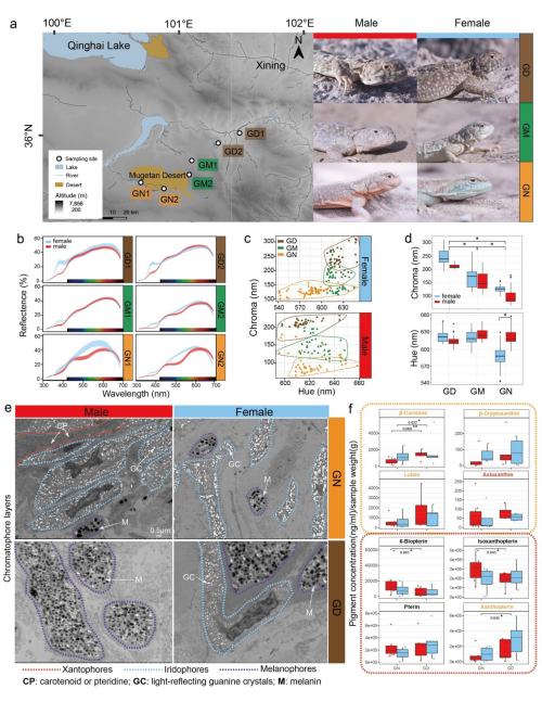 为了验证上述推测并揭示贵德沙蜥体色两性异型变化的遗传进化机制,中国科学院成都生物研究所副研究员吕彬与研究员齐银,综合采用光谱分析方法、透射电镜技术、液相色谱质谱法、全基因组测序和行为学控制实验,通过整合多层面跨学科数据分析,探究了沙蜥体色两性异型的遗传基础和进化机制。