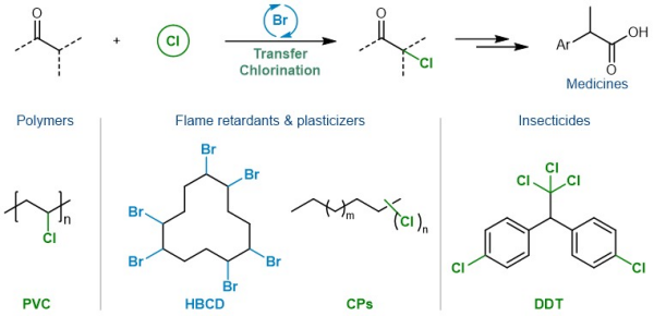 陈庆安团队致力于发展不同催化体系,以实现简单原料的高值化利用。在前期研究的基础上,该团队开发出烷基溴催化的氯转移反应,利用该反应可以合成具有高附加值的α-氯代酮,并能够实现烯烃的氯羟基化。进而,该团队开展了一系列对照实验和动力学研究,发现了该反应是通过卤素交换来实现不同分子间氯的转移。在机理的指导下,该研究利用溴代有机污染物六溴环十二烷(HBCD)实现了酮和芳烃的溴代。为了进一步验证该反应的实用性,该研究将氯转移反应应用于氯代有机污染物的再利用。研究发现,常见的氯代有机污染物如氯化石蜡、滴滴涕、氯甲基化聚苯乙烯及聚氯乙烯能够作为转移氯化反应的氯源。该团队直接利用HBCD作为催化剂,PVC作为氯源,快速合成α-氯代酮,再经过简单转化,实现了非甾体抗炎药萘普生、布洛芬和非罗考昔的合成。研究显示,废弃的PVC塑料同样能够作为氯源来合成氯代产物。尽管这些废弃塑料含有大量的塑化剂,但对氯化反应没有明显影响。因此,该反应在卤代有机污染物的再利用方面具有良好的应用前景。