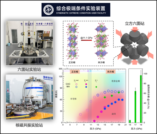 综合极端条件实验装置的六面砧高压实验站和强磁场核磁共振实验站的实物照片,以及La2PrNi2O7多晶样品的高压结构演化和超导相图。