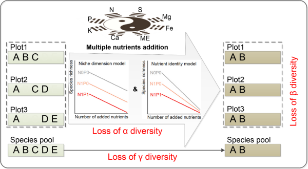 自2017年起,中国科学院植物研究所在欧亚草原最东端的呼伦贝尔草甸草原设置了包含17种元素的多养分添加实验平台。研究依托该实验平台发现,氮、磷添加将草地植物群落种间竞争的中心从地下转移到地上,进而对各尺度的植物多样性产生了负效应。研究显示,添加其他养分的种类数具有显著的负效应。同时,研究提出了养分添加类型和添加数量的重要性,并将“养分类型假说”与“生态位维度假说”相结合,为生物多样性研究与保护提供了新方向。