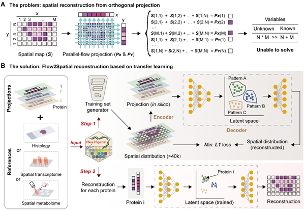 PLATO在断层扫描成像的重构原理中汲取灵感,通过降维后的平行流投影与深度学习算法Flow2Spatial相结合,重构出蛋白质的高分辨率空间分布。Flow2Spatial运用自编码器模型,将平行流投影的实验过程模拟为“降维编码”,并通过整合其他空间组学数据如组织学染色、空间转录组学等,对蛋白质空间分布进行高精度“升维解码”。这一原创算法突破了传统技术难以获取空间信息的限制,提高了空间蛋白质组的覆盖度和分辨率,为解析其他组学分子的空间分布提供了新方案。