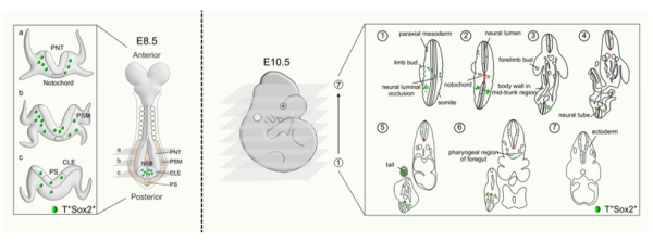 示踪的NMPs在胚胎E8.5和E10.5的时空分布
