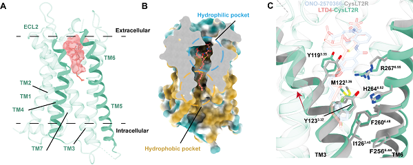(A)CysLT2R的LTD4结合口袋,(B)结合口袋的切面图,(C)CysLT2R与LTD4结合以及与ONO-2570366结合之间的相互作用的比较。