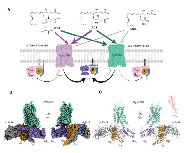 (A)半胱氨酸白三烯受体的G蛋白信号传导通路示意图,(B-C)激活态CysLT2R-Gαq-scFv16复合物的冷冻电子显微镜结构。