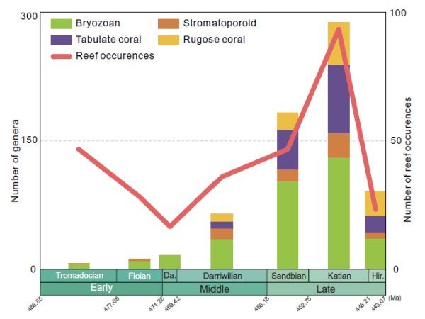 礁石建造动物群(层孔海绵、珊瑚、苔藓虫)的多样性(属的数量)和礁石出现随时间的变化