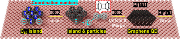 近日,中国科学院兰州化学物理研究所科研团队联合瑞士巴塞尔大学、奥地利萨尔茨堡大学的科研人员,在制备石墨烯量子点研究方面取得进展。该团队结合原位热退火与非接触原子力显微技术,在金属Pt(111)表面捕获到稳定的C60二聚体,并揭示了这种二聚体向石墨烯量子点乃至更大尺寸石墨烯片的完整演化路径。