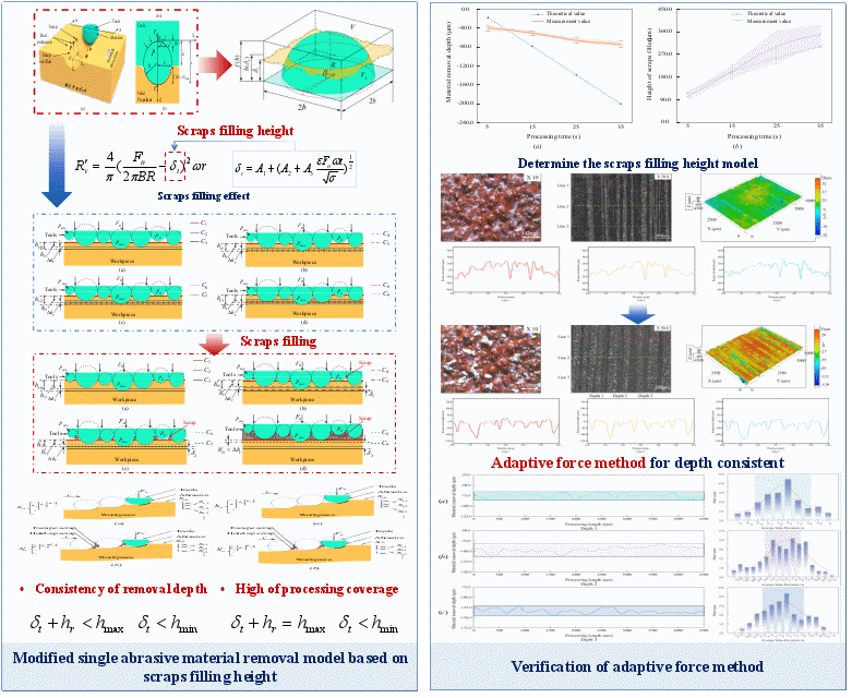 该研究分析发动机药柱表面粗化过程中去除深度大幅波动机理发现,切屑填塞磨料间隙是去除深度大幅波动的重要原因。研究构建了碎屑填充高度模型,引入了碎屑填充高度对材料去除模型进行修正。为减小波动幅度,研究通过分析工艺参数、碎屑填充和去除深度三者之间的关系,设计了确保表面粗化深度一致性的自适应力控方法。试验结果表明,这一方法可有效抑制碎屑的生成和填充,在提升处理覆盖率和处理深度一致性方面具有优势。