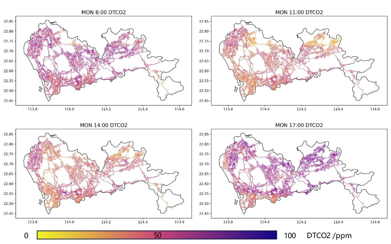为解决这一难题,研究团队与深圳生态环境监测中心站合作,组建了“全景AI碳排放走航观测平台”。该平台集成了全景摄像机、高精度温室气体分析仪、气象要素传感器等多源设备,可同步获取道路场景的三维环境特征(如交通密度、建筑布局、植被覆盖率)、气象参数(如风速、温度、湿度)及二氧化碳排放等信息。借助全景AI模型实现二氧化碳排放源的精准提取,模型的平均精度超过93%、平均误差低于1.3ppm。