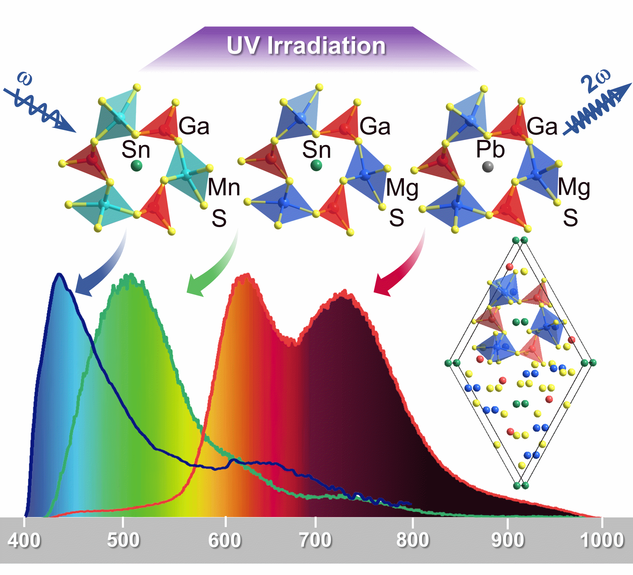 在上述工作的基础上,科研人员利用该家族化合物中八面体及四面体组成的风车状阴离子框架的孔道限阈效应,在AI0.5BII3CIII3QVI8家族合成出11例新的化合物,实现了该家族化合物带隙、二阶非线性光学效应及荧光性能的有效调控。其中,Sn0.5Mg3Ga3S8具备发光和非线性光学响应的双重功能特性。实验和计算结果表明,Sn0.5Mg3Ga3S8中强的非线性光学效应,主要归因于八面体及四面体基元协同组装诱导的非线性活性基元([SnIIS6]、 [GaS4])的有序排列。此外,该风车状框架结构表现出的基元可替代性,主要归因于结构中共点及共线的连接模式,而该结构的稳定性则主要来自于框架中共存的共面连接模式。