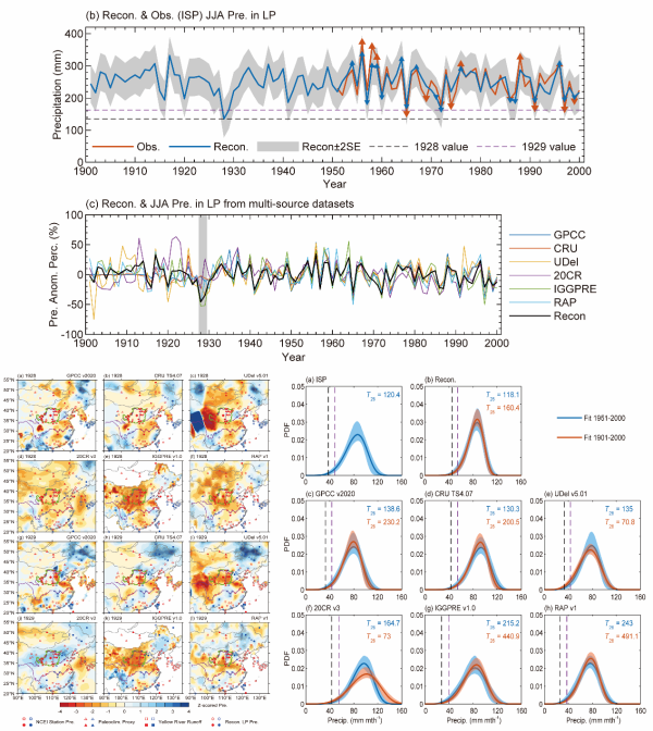 相关研究成果以Reanalysis Data Sets Underestimate the 1928-29 Summer Precipitation Deficits During the Late-1920s Megadrought in Northern China为题,发表在《地球物理研究快报》(Geophysical Research Letters)上。研究工作得到国家自然科学基金、中国科学院战略性先导科技专项等的支持。