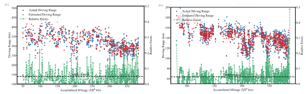 为了验证这套框架在真实世界中的表现,研究团队基于来自不同城市的乘用车与公交车,收集了长达3年、总行驶里程超过30万公里的实车运行数据。系统验证结果显示,该方法预测的剩余续航里程与车辆实际可行驶里程之间的平均相对误差低于5.5%。这一性能显著优于传统预测方法,充分证明了其在复杂工程场景中的可靠性与稳健性。进一步分析表明,整段行程的平均电流与平均车速是影响能耗的关键变量。数据表明,仅通过优化驾驶行为,乘用车的续航能力有望提升30%以上,公交车可提升10%以上。