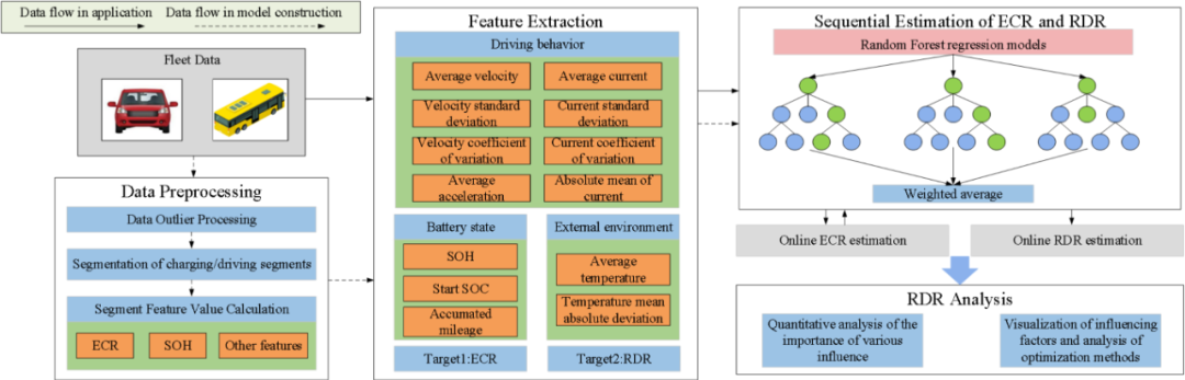 研究团队构建了一个面向实车应用的“在线续航估算与优化分析一体化框架”。不同于传统直接给出结果的“黑盒”预测,该框架利用随机森林算法,创造性地实现了“先能耗、后续航”的分步估算策略:首先综合考虑驾驶行为、环境温度、电池健康状态等多源因素,建立单位里程能耗率模型;进而基于能耗率精准推算剩余续航。这种分步建模方式不仅提高了精度,更显著增强了模型的可解释性。它能定量回答“究竟是什么因素、在多大程度上吃掉了续航”等问题,让算法不再是冰冷的数字。