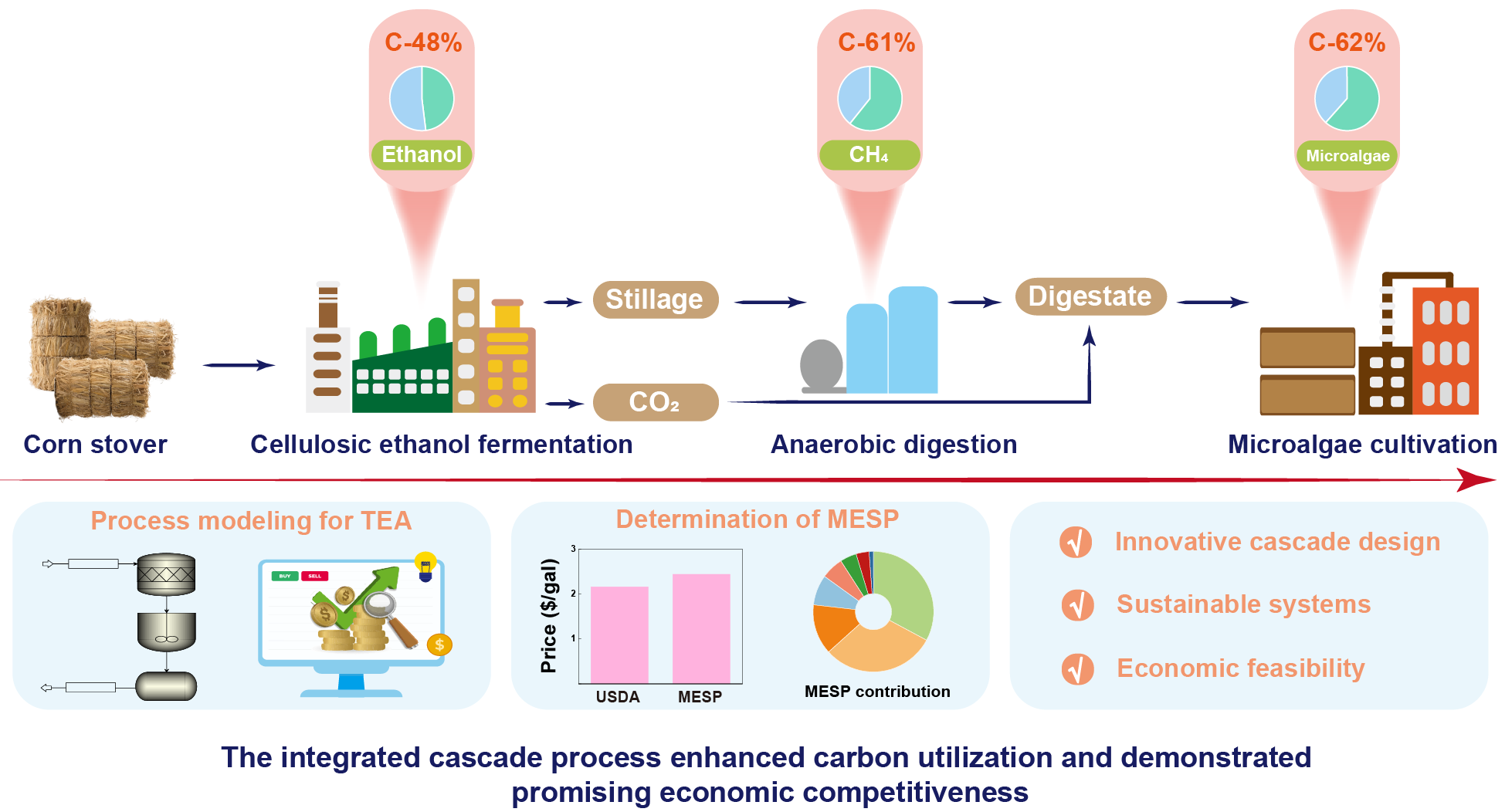 为破解这一难题,中国科学院成都生物研究所等,提出木质纤维素生物质碳资源的梯级利用路线,构建了“纤维素乙醇发酵—厌氧消化乙醇废醪液—沼液耦合乙醇尾气培养微藻”的三位一体集成梯级工艺,实现木质纤维素碳资源的全链条捕获与高值化转化。