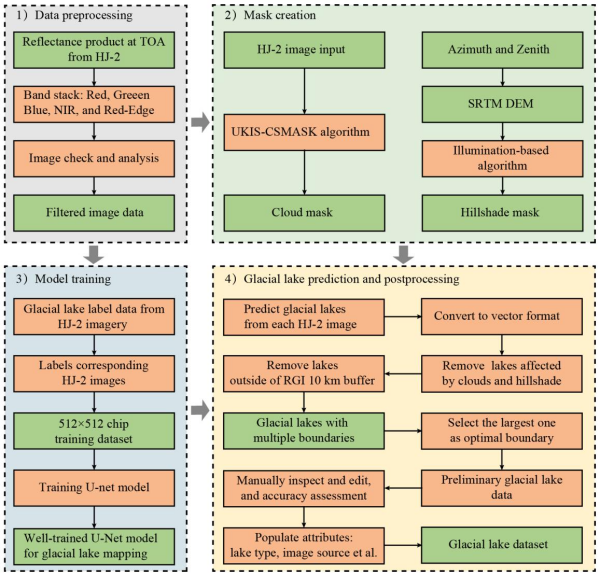 为应对上述挑战,中国科学院成都山地灾害与环境研究所等研究团队,基于国产环境减灾二号(HJ-2A/B)卫星数据,开发了一种依托高重访频率卫星影像的区域冰湖自动化制图技术。该研究充分利用HJ-2A/B卫星的高时间分辨率优势,将人工智能深度学习方法与遥感影像处理算法有机结合,实现了中喜马拉雅地区冰湖的高效遥感调查与动态监测。这一成果为破解高山复杂环境下冰湖监测的技术难题提供了新的解决方案。