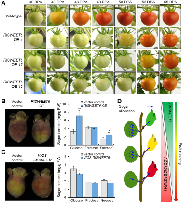 该研究证明了RtSWEET6可调控碳水化合物的源—库分配和果实成熟,揭示了碳水化合物代谢与果实发育之间的新联系。RtSWEET6的双重功能有助于桃金娘品质改良中的“高糖”和“耐储”两个目标的实现。
