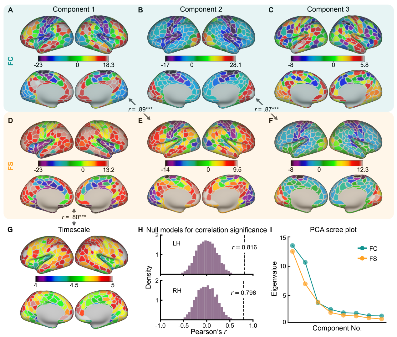功能连接和特征相似性的主成分分析显示,其中两个成分具有相似性,而另一个成分表现出明显差异