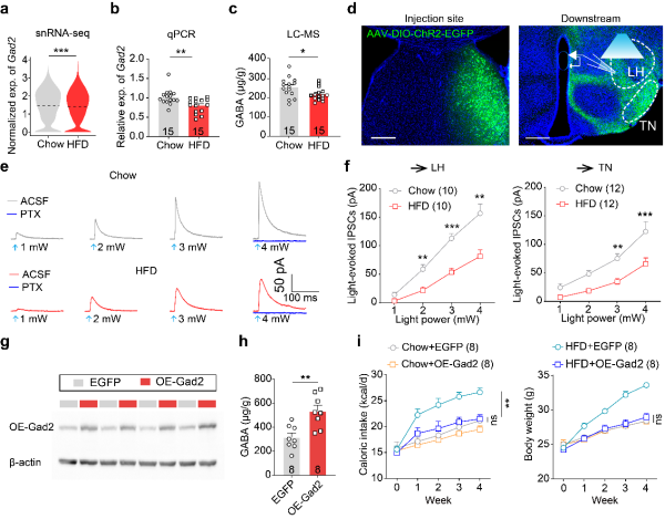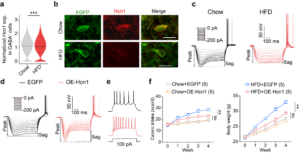 研究团队发现,长期吃高脂食物导致小鼠快速发生肥胖,同时其外侧隔核中的GABA能神经元的功能出现了明显减退。这些神经元中,两个关键基因的表达显著下降:一个是超极化激活环核苷酸门控阳离子通道1 (Hcn1),可以调节神经元兴奋性;另一个是谷氨酸脱羧酶2(Gad2),负责合成抑制性神经递质GABA。