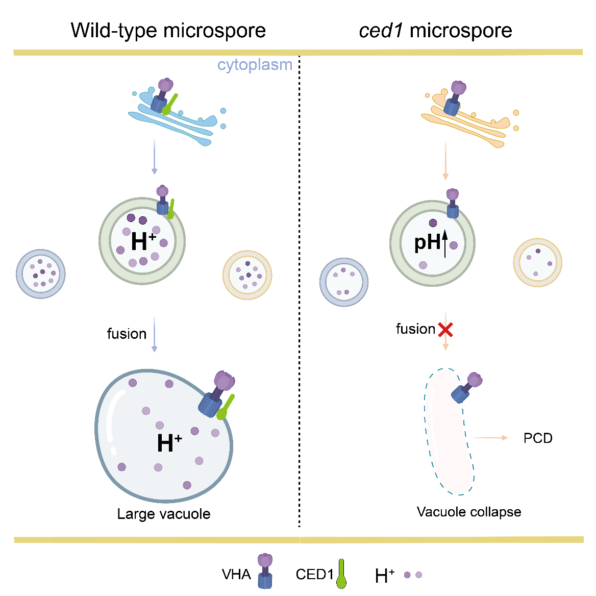 近日,中国科学院植物研究所以番茄为材料研究发现,CED1特异性地在减数分裂阶段的花粉母细胞和四分体中表达,其蛋白定位于质膜—内膜系统。CED1功能缺失导致完全雄性不育,该不育表型并非源自绒毡层异常,而是起因于小孢子发育异常。突变体小孢子无法形成中央大液泡,液泡质子稳态异常,激活液泡介导的PCD进程,染色质异常凝聚和片段化。进一步研究发现,CED1与液泡H⁺-ATP酶(VHA)c亚基互作,维持液泡质子稳态与酸性环境。因此,CED1功能缺失导致液泡pH值上升,最终触发液泡崩解和PCD。该研究不仅揭示CED1-VHA-c模块作为“液泡酸化监控-PCD执行”的分子开关控制小孢子命运,更为番茄等作物杂种优势利用提供了关键基因模块。